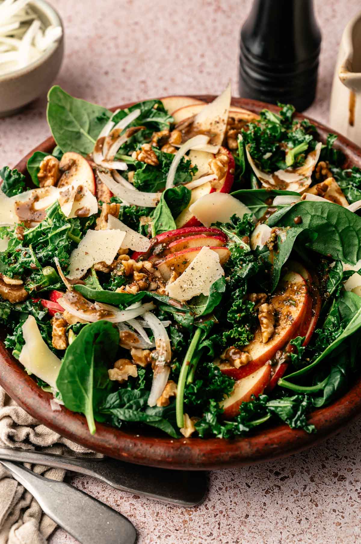 I served this kale salad, paired with the basil and balsamic vinaigrette, at a recent dinner party, and everyone wanted to know the recipe. (That’s a win in my book!) This kale spinach salad recipe is refreshing and uplifting, filled with nutritious ingredients. I felt good about serving this to my favorite people and loved that they absolutely couldn’t get enough of it. It’s a versatile salad, and the vinaigrette is too, which is something you can use beyond salad for anything and everything!