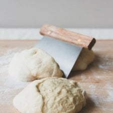 - With floured hands, divide dough into two sections onto a floured surface. At this point you can place one chunk in a freezer-specified ziplock bag and freeze it for later OR you can make two pizzas now!