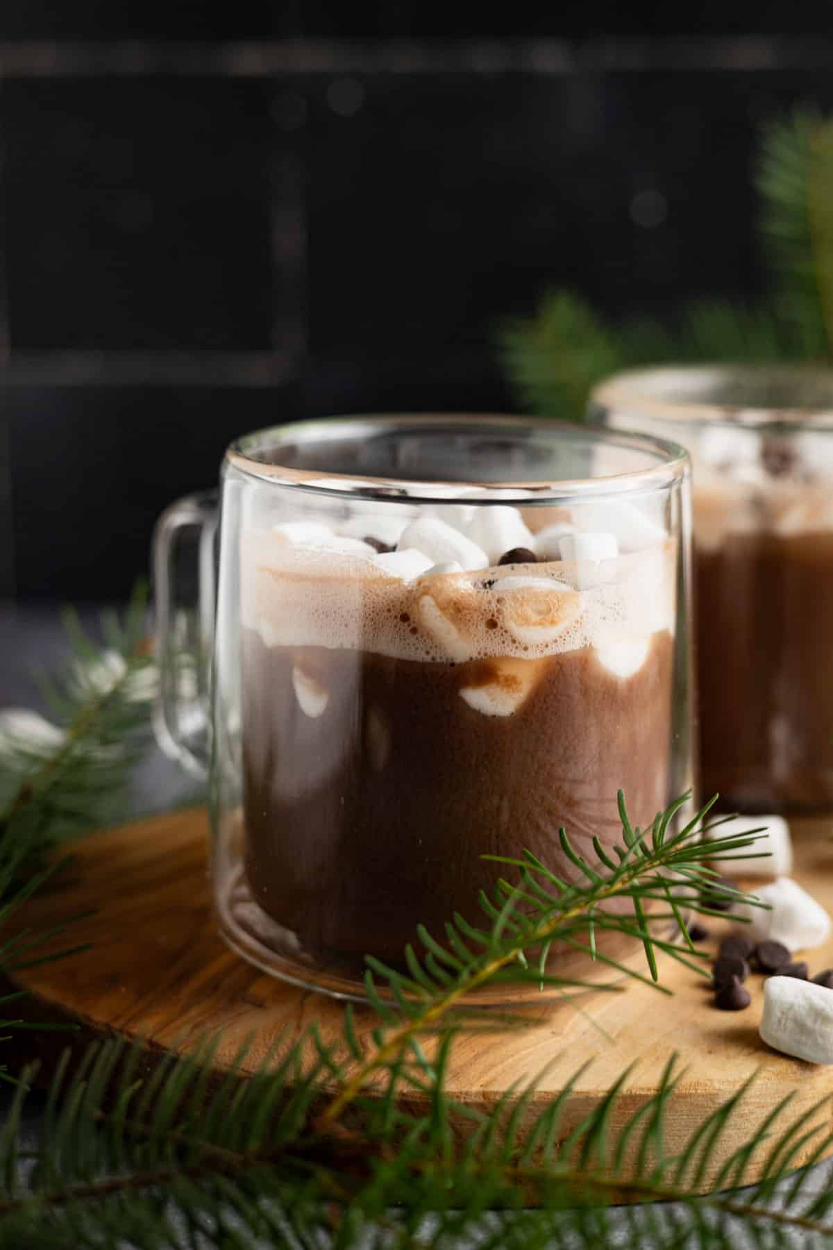 Vegan hot chocolate that uses cocoa powder, oat milk, and maple syrup. Talk about rich and creamy!