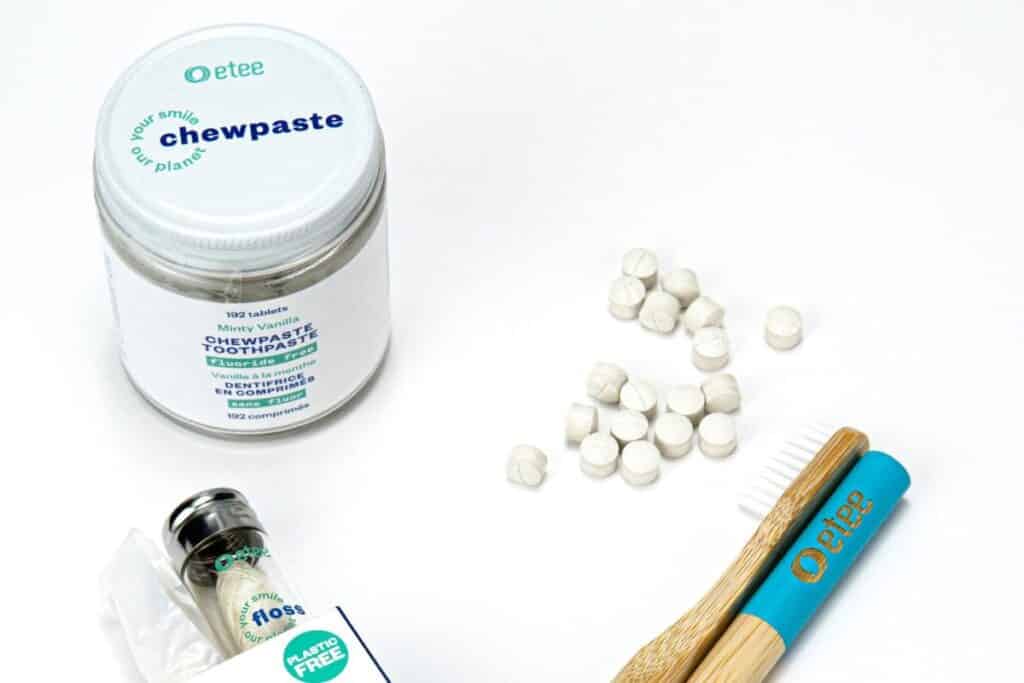 Etee offers a fluoride option in their Minty Vanilla Chewpaste. Just like the fluoride-free alternative, chew the tablets into a paste and use a wet toothbrush to clean.